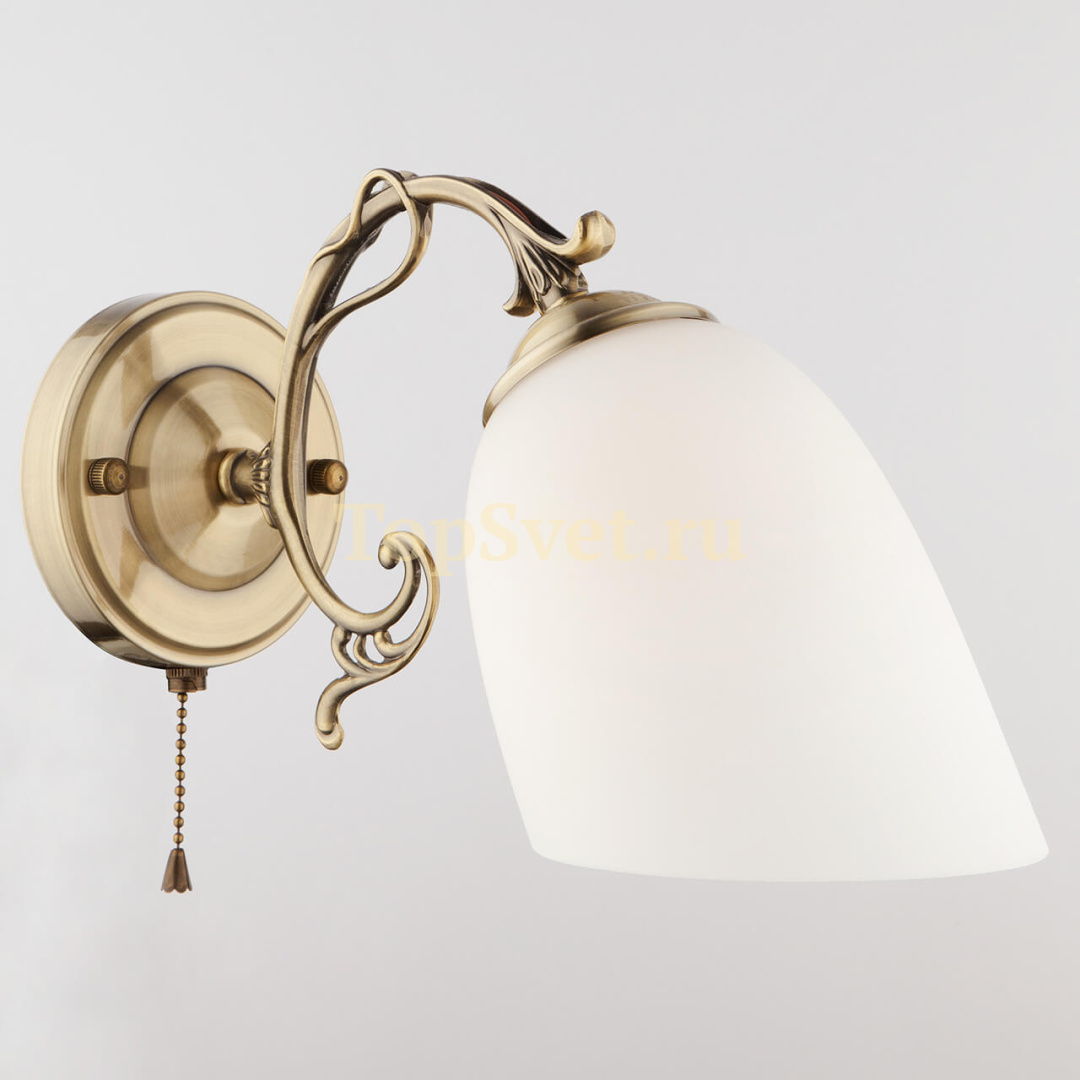 Корпус настенного светильника создан из качественного металл, цвет каркаса - бронза, цвет плафона - белый, что придает этому светильнику изысканности.
