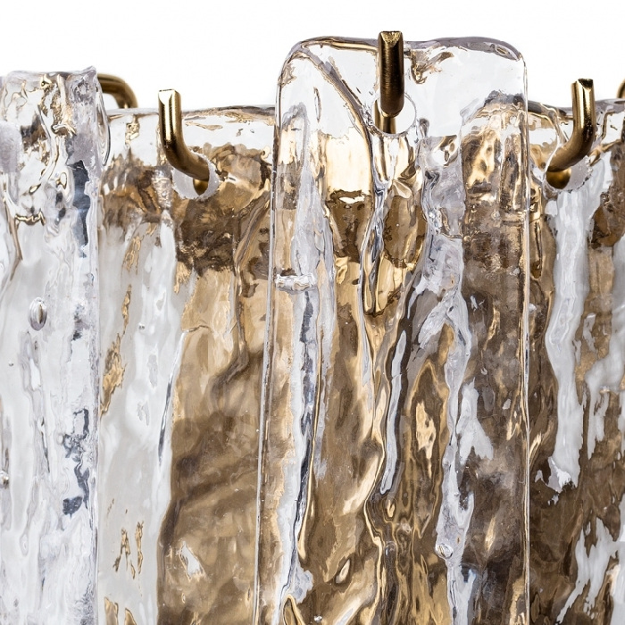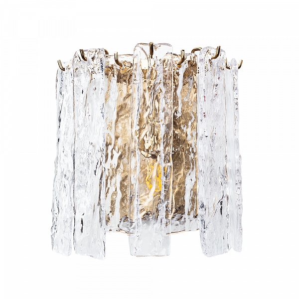 Корпус настенного светильника выполнен из надёжного металл, цвет корпуса - латунь, цвет плафона - прозрачный, что придает этому светильнику гармоничности.