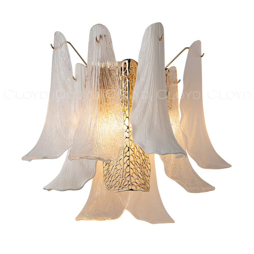 Корпус настенного светильника реализован из надёжного металл, цвет арматуры - золотой, цвет плафона - белый, прозрачный, золотой, что придает этому светильнику благородности.