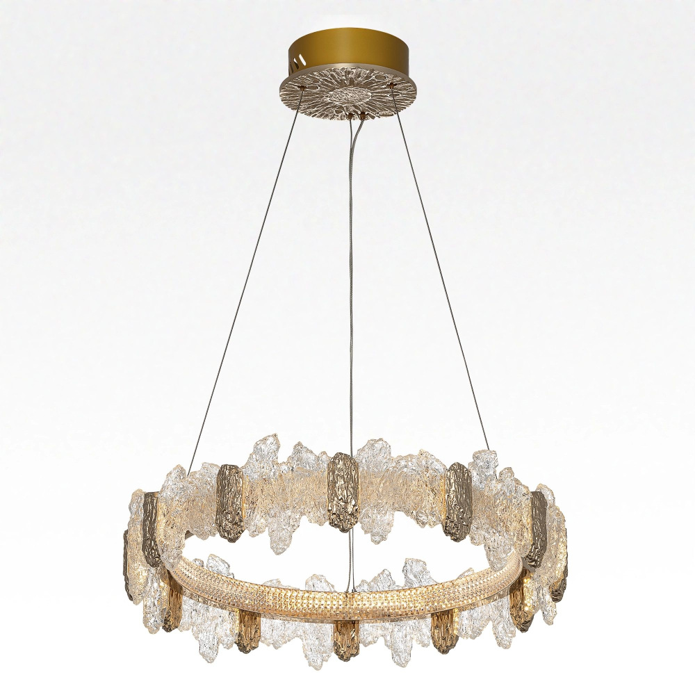 Каркас подвесной люстры создан из прочного металла, а золотой цвет придаст вашему интерьеру изысканности. Плафон выполнен в прозрачном цвете, что добавляет модели легкости, благородства и завершенность образа.