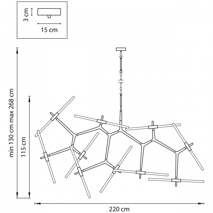 Размеры светильника: ширина 2200 мм, высота 1150 мм. - такие размеры позволяют люстре идеально смотреться как в просторных, так и в небольших помещениях.