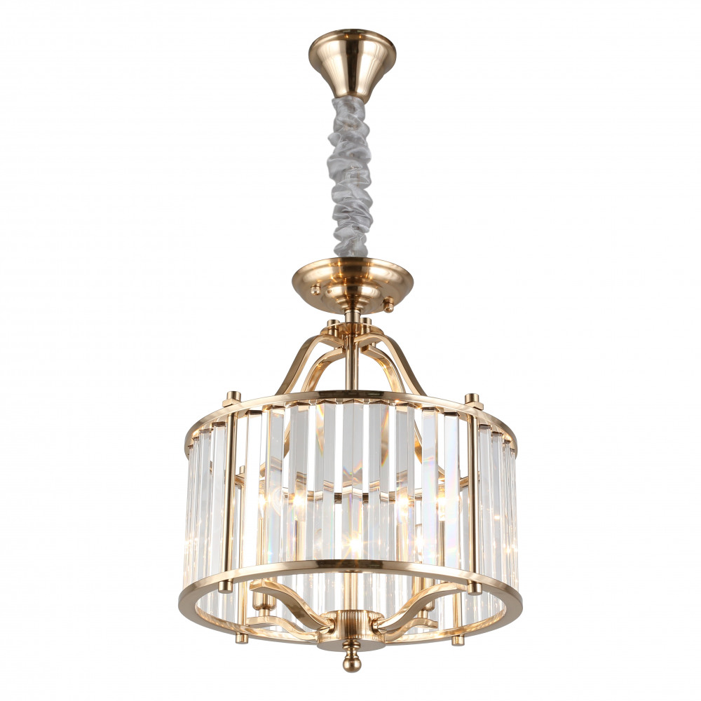Каркас подвесной люстры сделан из надежного металла, а золотой цвет придаст вашему интерьеру изысканности. Плафон выполнен в прозрачном цвете, что добавляет модели легкости, элегантности и завершенность образа.