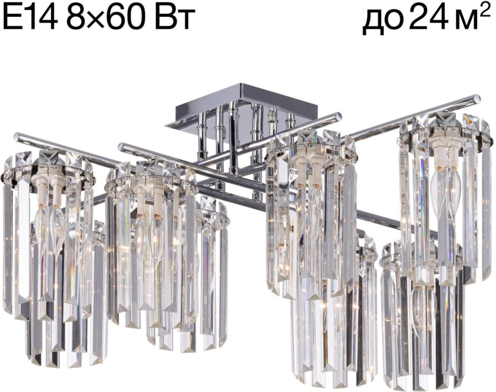 Для создания яркого освещения в светильнике предусмотрены лампочки в количестве 8 шт. с цоколем E14 и общей мощностью 480 Вт., благодаря чему обеспечивается достаточное освещение для помещений площадью до 24 кв.м.