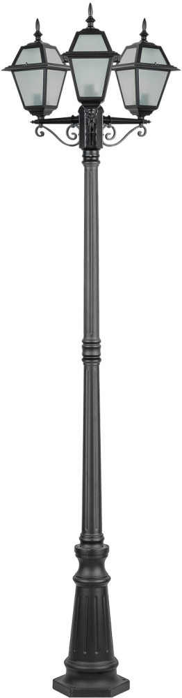 Светильник оснащён тремя плафонами, направленными вниз, что обеспечивает равномерное освещение площади до 15 квадратных метров. Каждый плафон рассчитан на лампу мощностью до 100 Вт с цоколем E27, что в сумме даёт общую мощность 300 Вт. Это позволяет создать яркое и комфортное освещение на вашем участке.